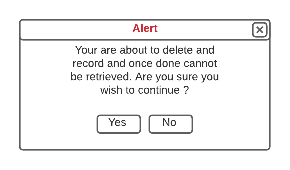 • If Yes is selected then delete the row, close pop-up and return to the active tab (the tab that the user was in at the time of pressing the cancel button) in view mode